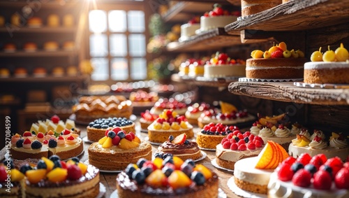 cake, bakery, dessert, fruit, pastry, sweet, food, berry, raspberry, blueberry, apricot, peach, strawberry, display, rustic, wooden, shelf, homemade, delicious, fresh, baked, shop, cake, treat, epicure, confectionery, sugar, icing, cream, arrangement, variety, colourful, artisan, table, window, light, daylight, sunlight, interior, closeup, detail, fruit cake, dessert, bakery goods, chocolate, slice