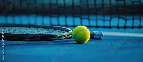 tennis, racket, ball, court, net, blue, tone, sport, string, grip, handle, rubber, nylon, shadow, lighting, texture, fuzz, leather, tension, grid, competition, equipment, dynamic, sharpened, contrast, vibration, speed, motion, synthetic, netting, chain link, concrete, line, marking, bounce, energy, velocity, athleticism
