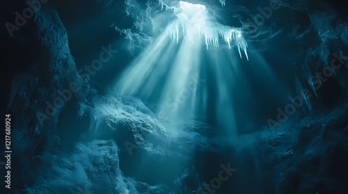 tight, shot, ice, cavern, interior, illuminated, radiant, beam, up high, canyon, illustration