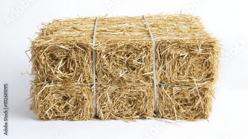 A tightly bound square straw bale resting on a white background, showcasing its texture and structure in vivid detail.