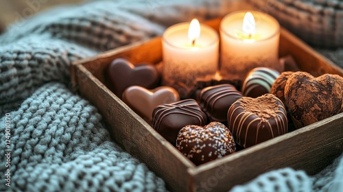 A top-down view of a Valentine's Day chocolate gift box filled with diverse chocolates, set amidst a warm ambiance of candles and soft pillows:A top-down image of a Valentine chocolate gift box