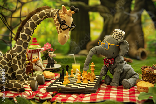 elephant, giraffe, animal, toy, goggles, chess, play, nature, funny, picnic, illustration, design, art
