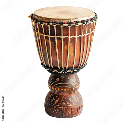 A traditional wooden djembe drum with a leather top, isolated on a white background This percussion instrument is a symbol of rhythm and cultural heritage, crafted with tribal and indi