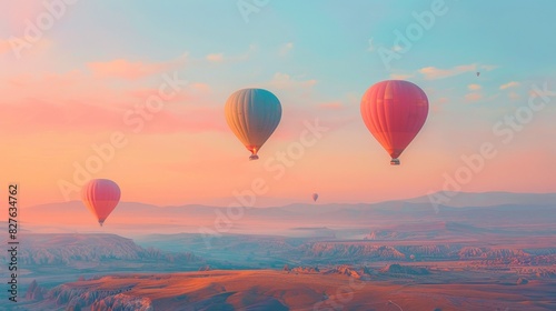 A tranquil morning with hot air balloons rising gently into the sky, their colors vibrant against the soft pastel hues of dawn. The minimalist approach captures the peacefulness and beauty of the