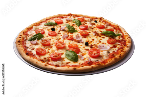 A transparent background showcases an Italian pizza adorned with fresh vegetables and basil leaves, alongside melted mozzarella cheese, green olives, and tomato.