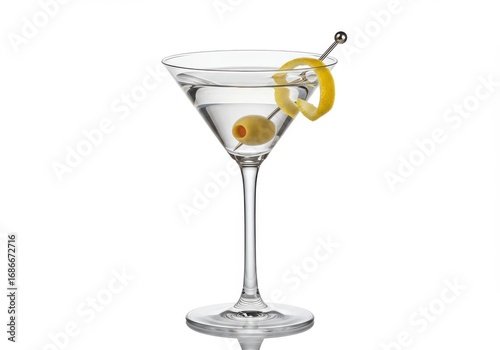 A transparent martini glass, filled with a clear liquid, garnished with a lemon twist and olive, stands on a plain white background.
