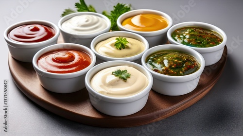 A variety of dipping sauces served in white ramekins on a clean surface. Perfect for food menus, advertisements, recipe blogs, and restaurant promotions showing fresh condiments.