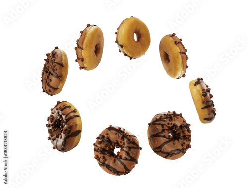 A variety of donuts are displayed in a circle. Each donut features different toppings such as chocolate drizzle and colorful sprinkles. They look fresh and tempting.