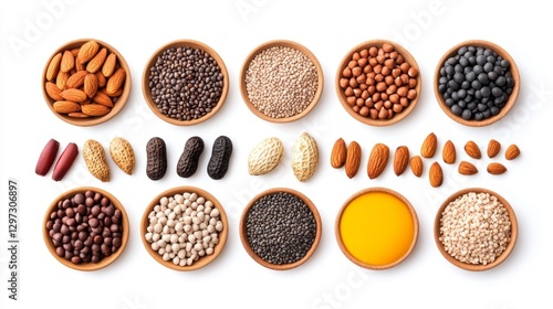 A variety of healthy nuts and seeds isolated on a white background. Generative AI