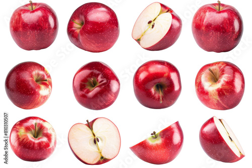 A variety of red apples on a white background. The apples are whole, halved, and sliced.
