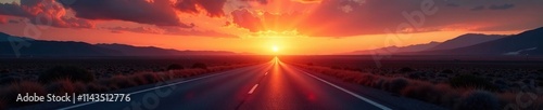 A vast expanse of orange-hued sky extending straight ahead towards the highway as day succumbs to night, landscape, twilight