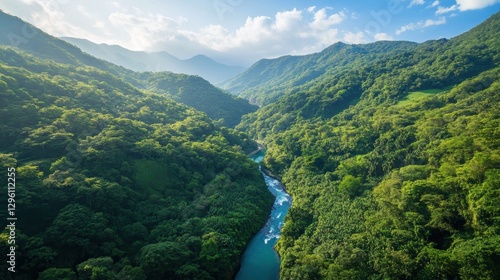 verdant, canopy, emerald, green, cascading, down, slope, natural, park, meandering, ribbon, turquoise, river, bathe, gold, hugs, sunlight