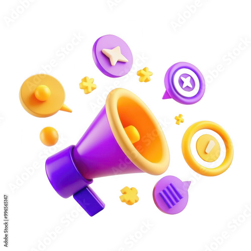 three-dimensional, model, megaphone, icon, colourful, communication, digital, marketing, design, render, isolated, bright, purple, yellow, star, circle, sound, graphic, symbol, loudspeaker, media, art, creative, vector, object, play, alert, notification, speech, announcement, announce, message, expression, symbolic, graphic, modern, perspective, shape, abstract, style, concept, illustration, visual, presentation, dynamic, youthful, bold, fun, signs