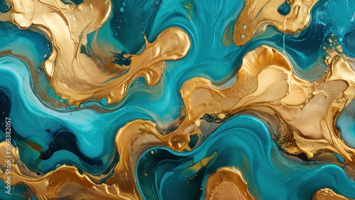 A vibrant abstract art piece featuring flowing turquoise and gold hues, creating an elegant and luxurious feel perfect for modern decor