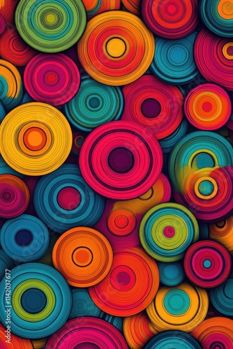 A vibrant abstract design featuring colorful concentric circles in various sizes and hues.
