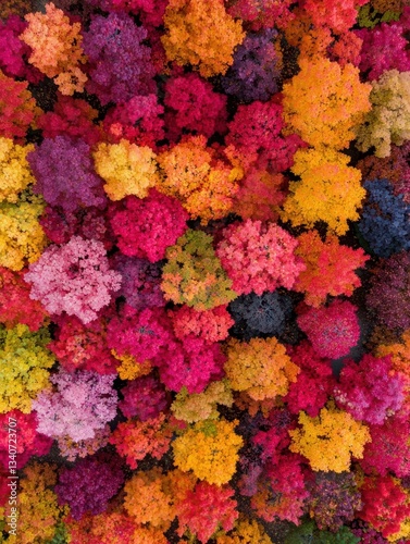 A vibrant aerial view of autumn trees showcasing a stunning array of colorful foliage in shades of red, orange, yellow, and purple.