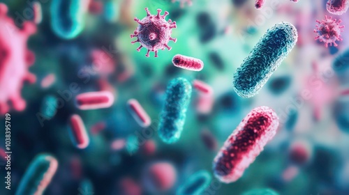 A vibrant and colorful 3D rendering of various types of bacteria floating in space, including a pink virus, a green rod-shaped bacteria, and blue rod-shaped bacteria.