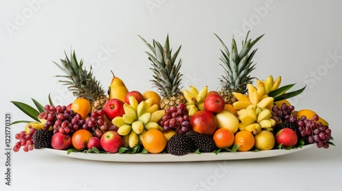 A vibrant arrangement of fresh fruits, including pineapples, mangoes, bananas, and grapes, displayed in an elegant bowl.