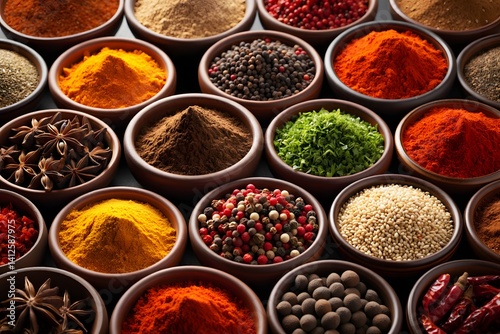 A vibrant array of spices, each meticulously arranged in individual bowls, offers a tantalizing glimpse into a world of flavor and culinary artistry. The colors, textures.