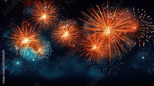 A vibrant burst of orange fireworks illuminating the night sky with a deep blue background