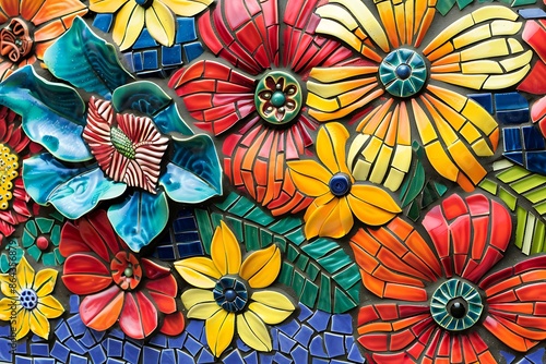 A vibrant ceramic mosaic showcasing a burst of abstract flowers