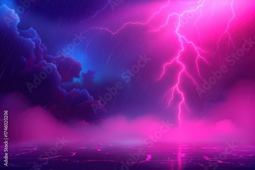 A vibrant digital artwork depicting a stormy sky with pink lightning, dramatic clouds, and rain, creating a surreal and atmospheric scene.