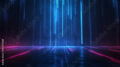 A vibrant digital background featuring vertical lines of blue and pink light against a dark surface.