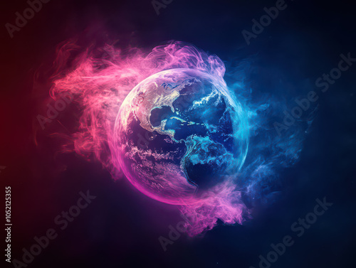 A vibrant Earth enveloped in swirling pink and blue nebula-like clouds against a dark cosmic backdrop.