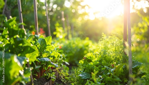 A vibrant garden bed bursting with fresh, green plants, bathed in the golden light of sunset.