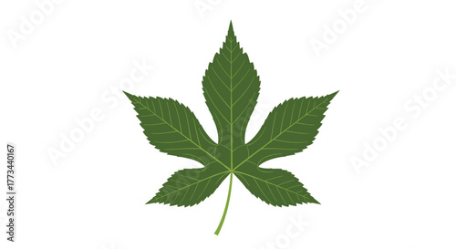 A vibrant green, five-lobed leaf with serrated edges and prominent veins, symbolizing nature, growth, and environmental concepts, isolated on a white background.