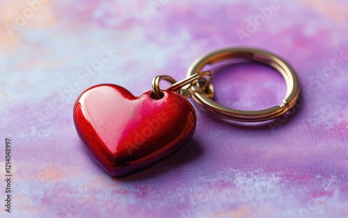 A vibrant red heart-shaped keychain on a soft pastel purple surface designed for Valentines Day and 8 March