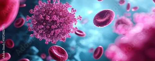 A vibrant representation of a virus interacting with red blood cells, highlighting the microscopic world of human biology.