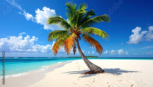 A vibrant tropical beach scene showcases a lone palm tree on a pristine white sand shore, bathed in sunlight and featuring a tranquil turquoise ocean.