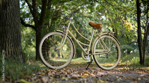 A vintage bicycle with a brown seat and cream paint is parked on a leaf-covered path in a forested area during the daytime.