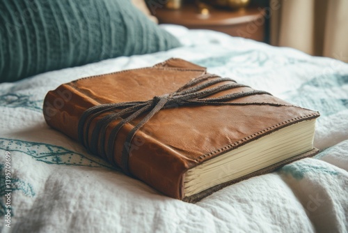 A vintage leather-bound journal rests elegantly on a textured bedspread, suggesting stories untold and secrets kept.