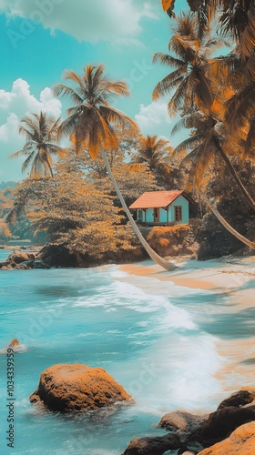 A vintage-style scene of a sunny beach with palm trees and turquoise water, a small house on the shore surrounded by lush greenery