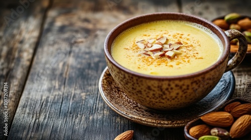 A warm cup of Kesar Badam Doodh, golden saffron milk topped with chopped almonds, pistachios, and a sprinkle of nutmeg, set on a rustic wooden table with scattered nuts and cozy textures.