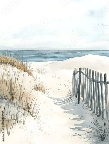 A watercolor of white sand dunes, a wooden fence, and a soft blue ocean in a minimalist style