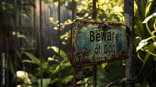 A weathered sign affixed to a fence alerts passersby to beware of a dog, surrounded by vibrant greenery and foliage