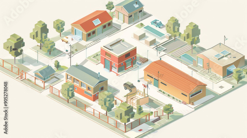 isometric, illustration, neighbourhood, building, tree, pathway, suburban, calm, orderly, small town, quaint, community, house, skyline, street, layout, map, design, architecture, rooftop, car, park, modern, environment, residential, serene, city landscape, artistic, colourful, drawing, painting, detailed, lifestyle, cosy, peaceful, real estate, landscape, visual, diagram, city landscape, graphical