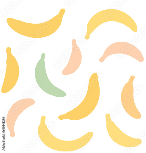 A whimsical pattern of pastel-colored bananas scattered across a white background.