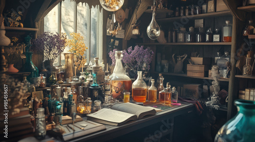 A whimsical witch workshop filled with potion bottles, spell books, and magical items.