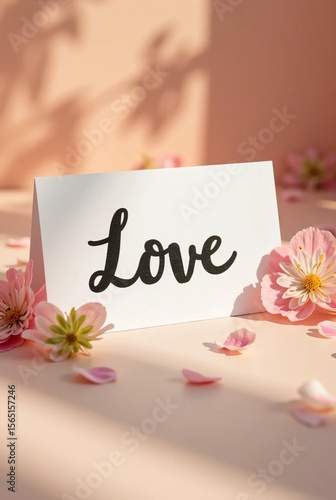 A white card with the word “Love” written in cursive rests on a pink surface, surrounded by soft petals and flowers, evoking romance and tenderness, vertical composition