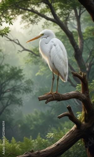 A white heron perched on a tree branch overlooking a serene forest landscape, white heron, nature reserve, tree branch