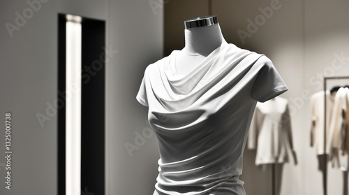 A white t-shirt is showcased on a minimalist mannequin inside a contemporary clothing store Soft lighting enhances the modern atmosphere of the store