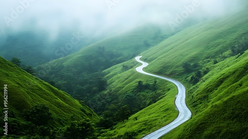 A winding road through lush green hills shrouded in mist, creating a serene and tranquil landscape perfect for nature lovers.