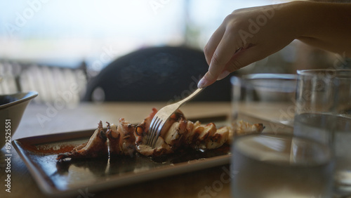 woman, octopus, grilled, eatery, hand, fork, dish, closeup, eating, seafood, delicious, epicure, meal, lunch, dining, casual attire, lifestyle, epicure, vacation, plate, table, glasses, drink, relax, travel, culinary, appetising, taste, exquisite, favor, fresh, cookery, ambient, alcohol, gathering, comfortable, coastal, sunny, holiday, summer, carefree, enjoyment, brunch, setting, tasting, international, delightful, refreshing
