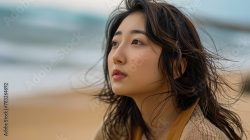 A woman standing on the beach by the ocean. Ideal for travel and vacation concepts