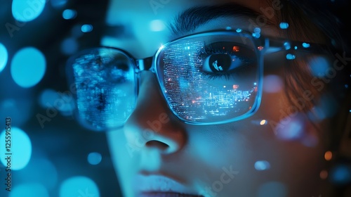 A woman wearing AR glasses interacts with holographic data, symbolizing augmented reality, AI, smart wearables, digital evolution, and futuristic technology.