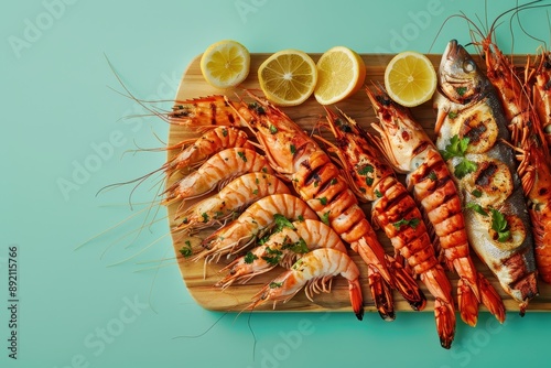 A wooden board with a variety of seafood including shrimp, fish